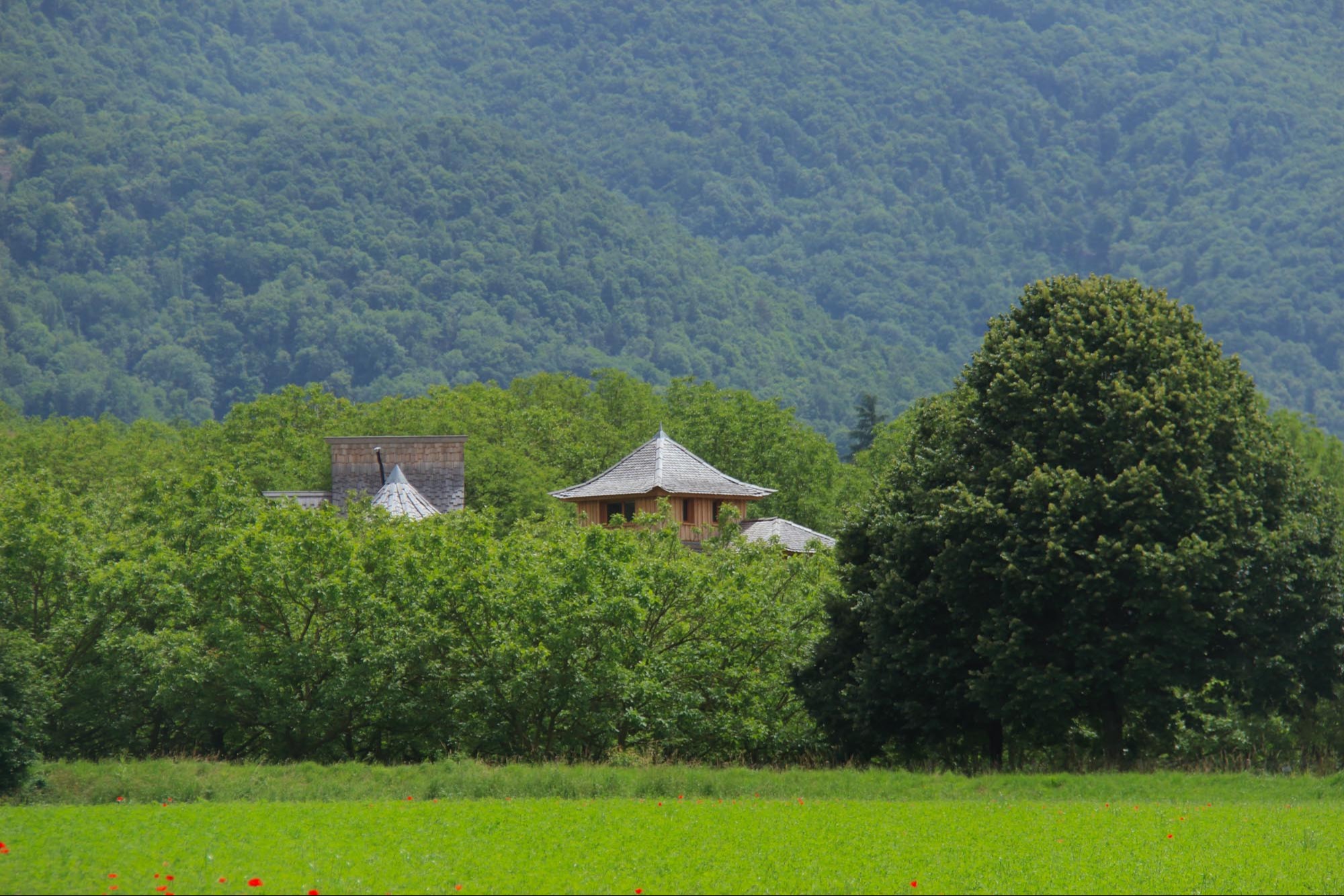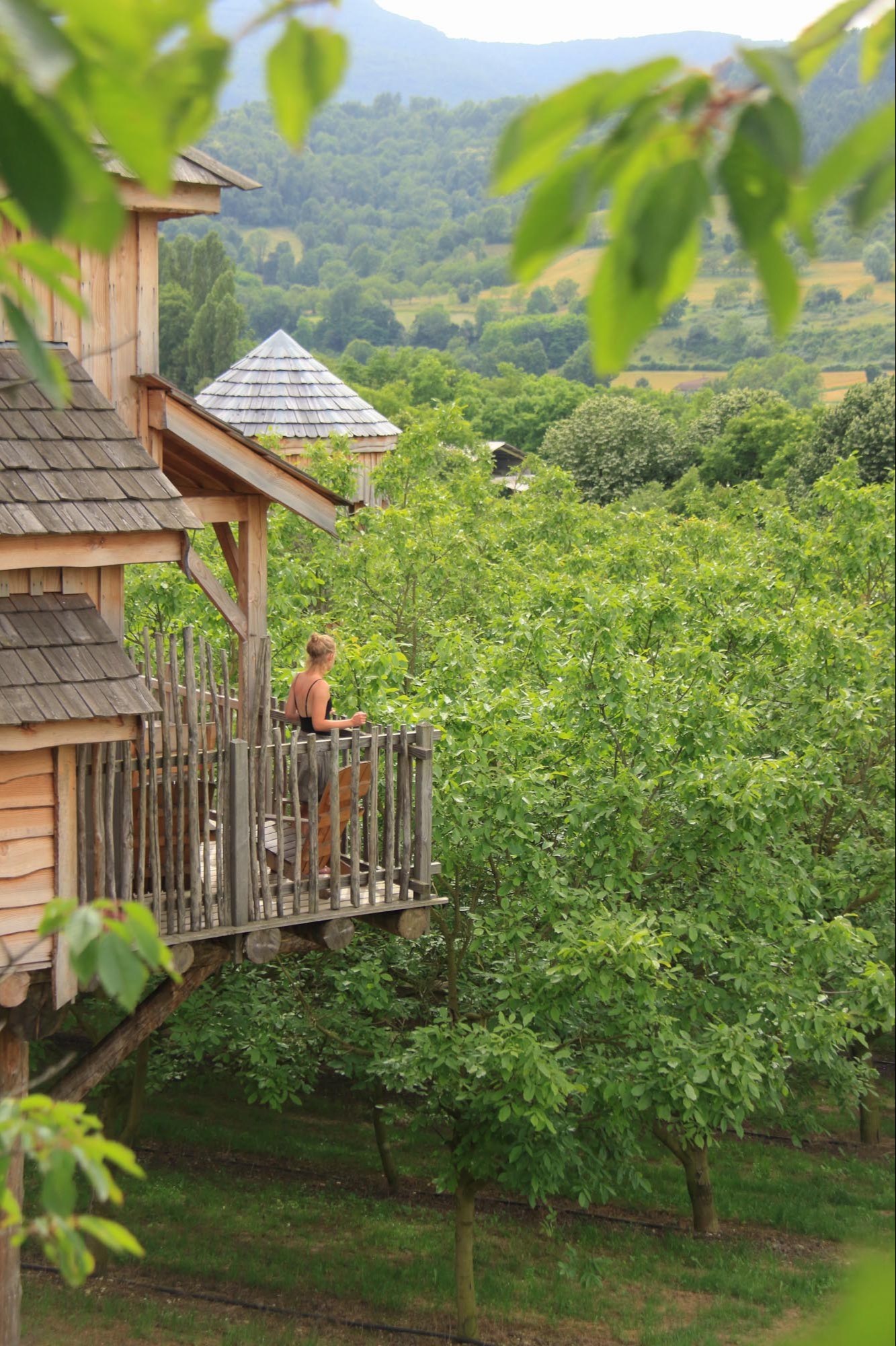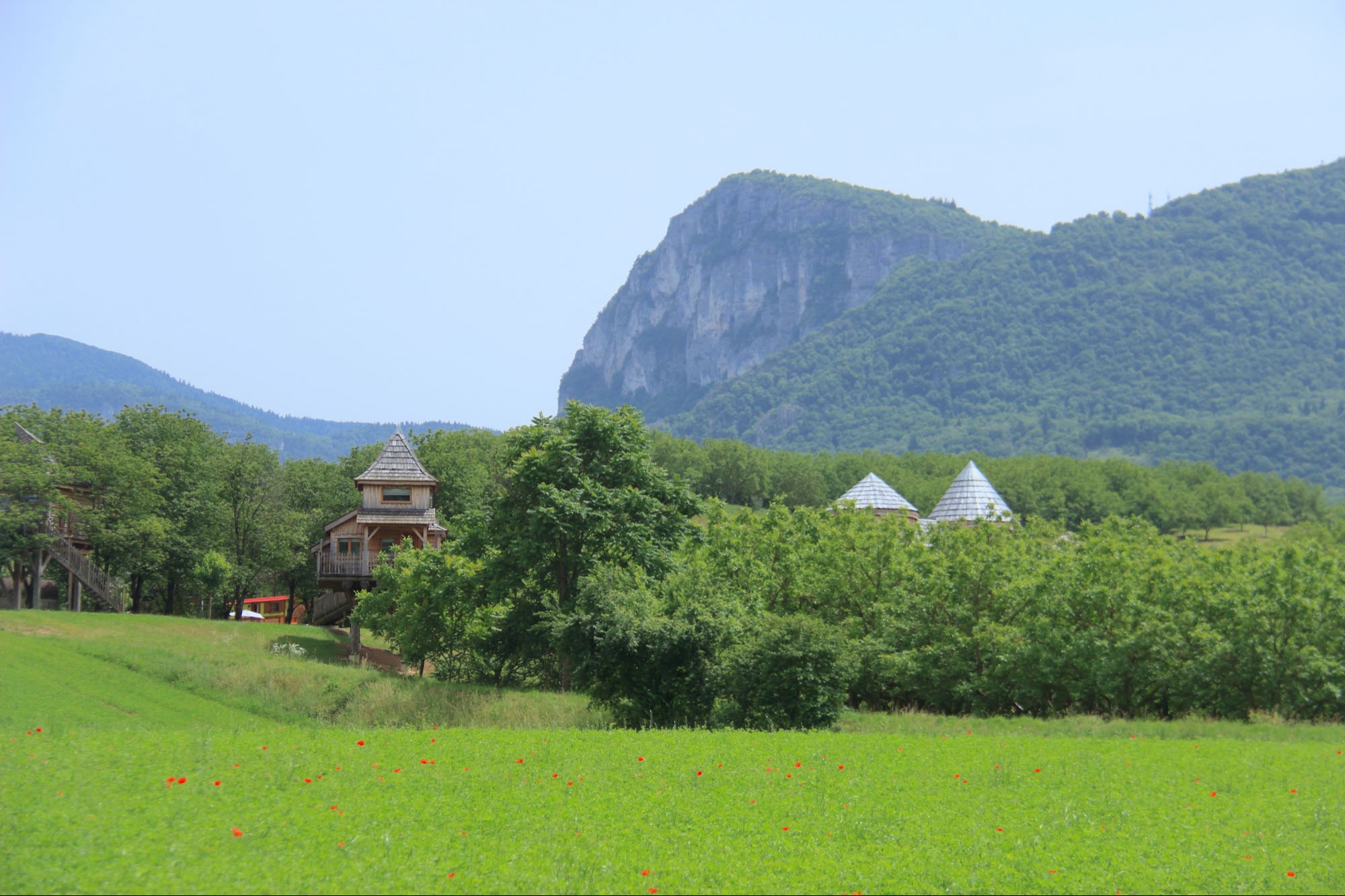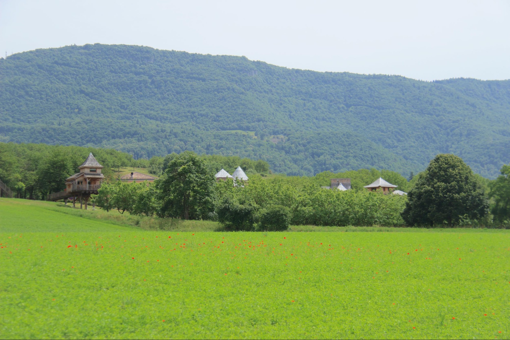 In 2017 a first trailer is installed with a view on the walnut trees. Three other trailers and a tree house have been added since.