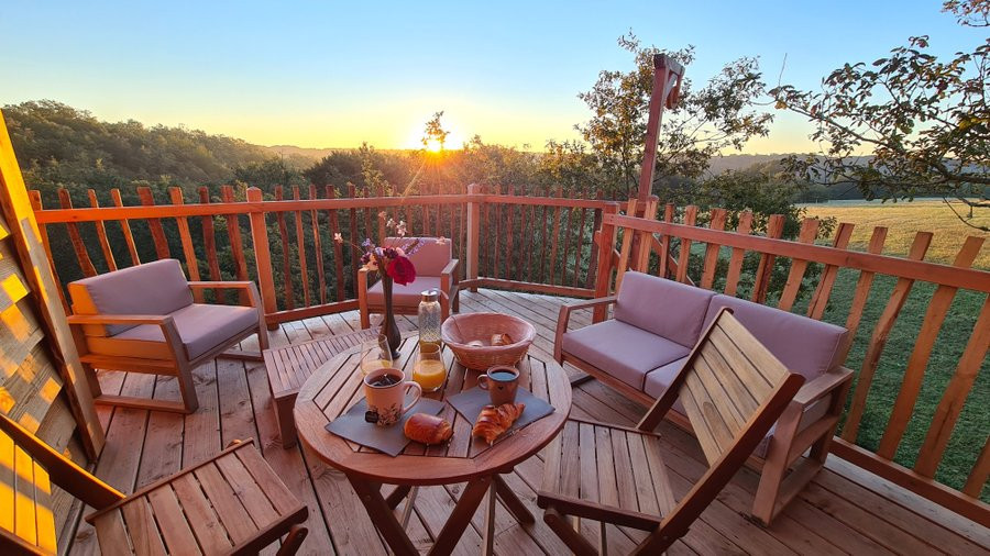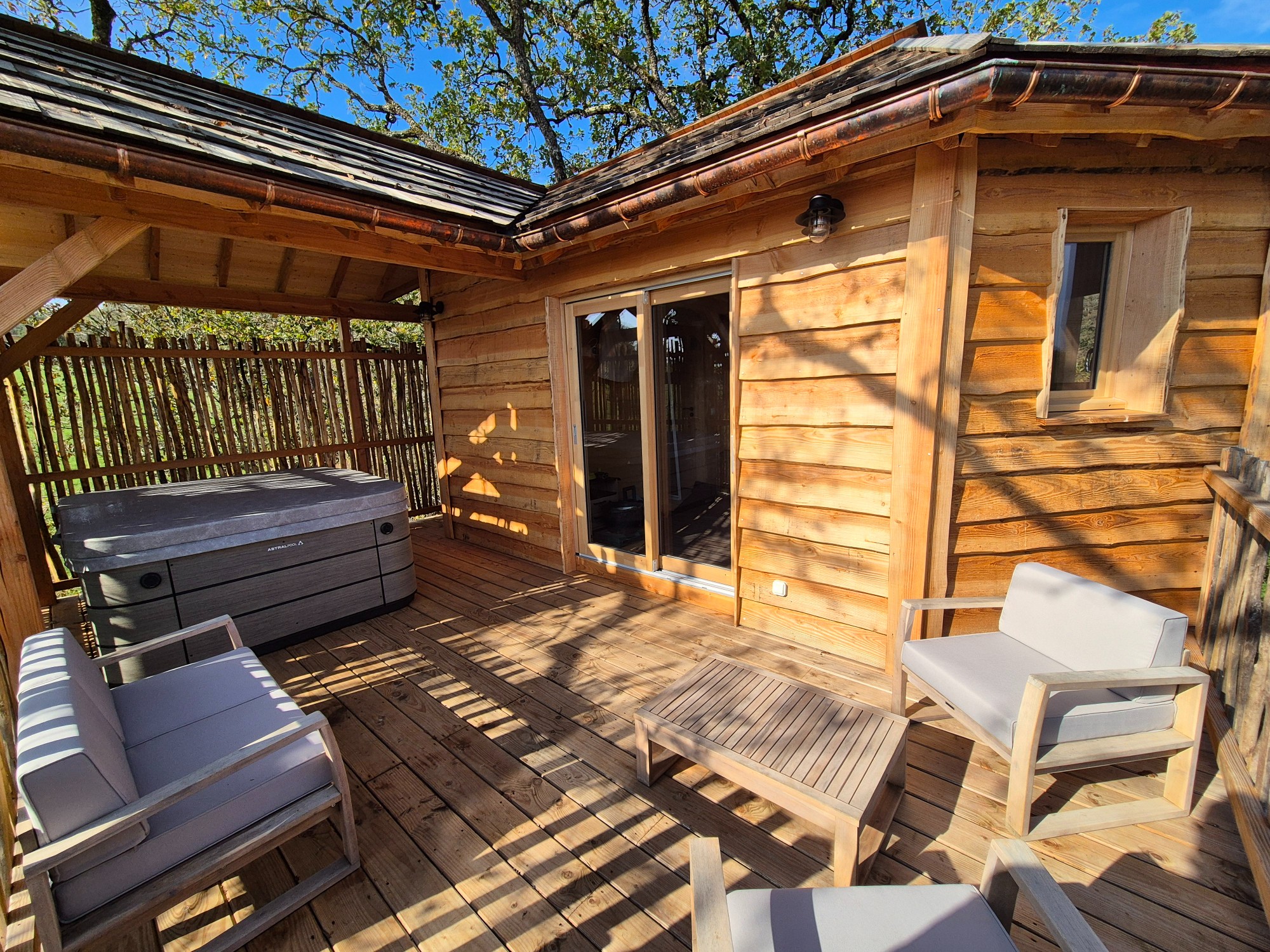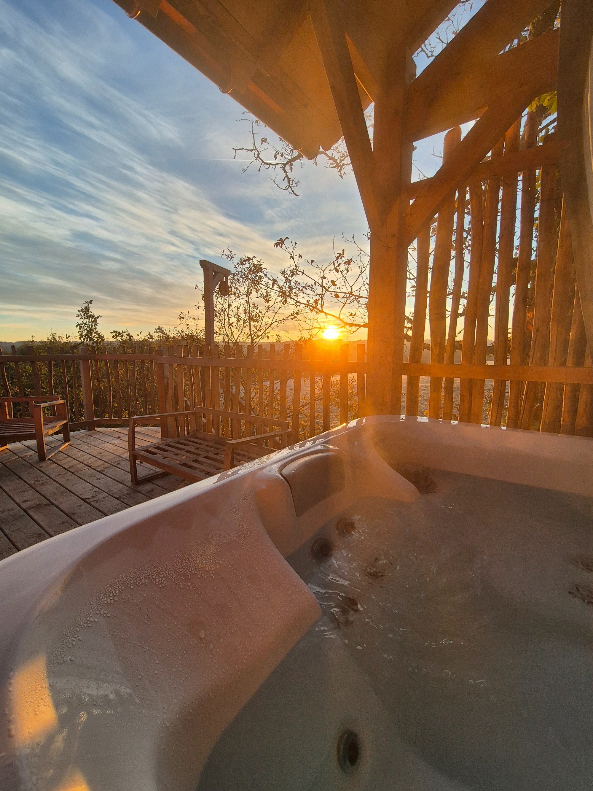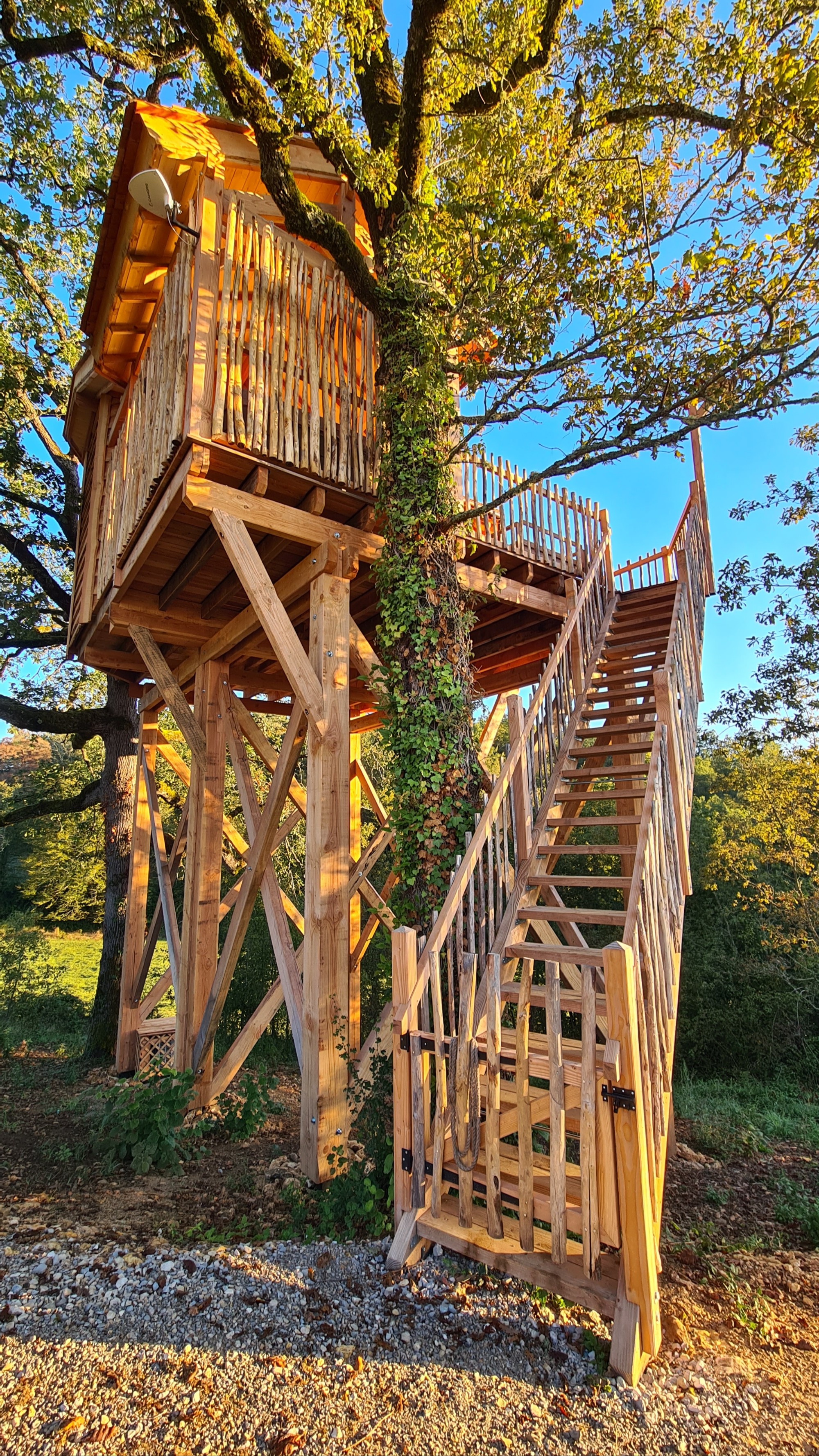Perched seven metres above the ground at Ferme de la Blogeonie, this treehouse cabin offers a singular blend of rustic charm and refined comfort. Ideal for couples seeking a romantic getaway or travelers who want an intimate encounter with the Périgord Noir countryside, the cabin delivers privacy, panoramic views, and a genuine farm atmosphere. The highlight is the heated spa, available all year, where guests can unwind beneath the sky after a day of exploring. The cabin is thoughtfully equipped to maximise comfort while preserving its natural appeal. Large windows invite daylight and nature into the living space, and outdoor seating areas offer tranquil spots for morning coffee or evening star-gazing. Guests at the treehouse can enjoy optional local dining choices prepared by the hosts: a traditional Salade Périgourdine and an apéritif plate for two, both made with farm-fresh ingredients. For breakfast and treats, Virginie prepares homemade pastries from the farm’s fruits, walnuts, and honey — perfect for a slow morning in the treetops. Marc and Virginie, the owners, bring hands-on experience to the guest experience. Former nurserymen who reinvented their life in 2020, Marc now manages around one hundred productive beehives, while Virginie focuses on transforming the farm’s harvest into artisanal pastries. Their knowledge of local producers, markets, and seasonal events makes them excellent guides for discovering the region. Practical information for guests: pets are not accepted. Same-day reservations close at 11:00. Check-in is between 17:00 and 19:00, and check-out is before 10:30. The cabin is located only a 10-minute drive from Sarlat-la-Canéda and the prehistoric Lascaux caves, and just 500 metres from the Flow Vélo route — an excellent start point for cycling tours through the Dordogne countryside. Nearby markets and activities enrich the stay: weekly farmers’ markets in Saint Geniès and Sarlat, summer Market Gourmand evenings, winter truffle markets, and canoe or kayak trips on the Dordogne and Vézère rivers. Whether you come for relaxation, gastronomy, or outdoor adventure, the treehouse cabin at Ferme de la Blogeonie provides a memorable base to explore the Périgord Noir.