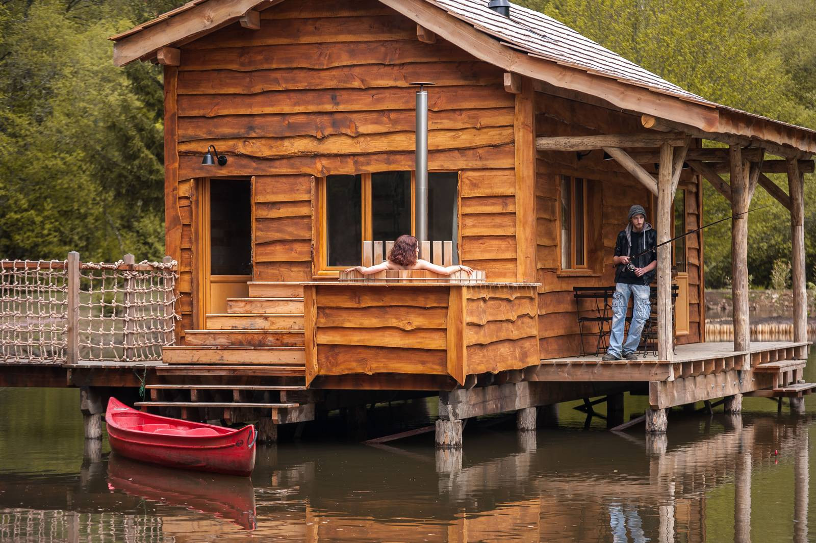 Cabane du Lac is a high-end floating cabin designed for guests who want to combine luxury with the tranquility of life on the water. The cabin includes two bedrooms, a full bathroom, an integrated kitchen, a stone fireplace and a private Nordic spa on the terrace. Modern conveniences such as free Wi-Fi, television and heating ensure comfort for stays across seasons. The cabin’s design emphasizes relaxation: soft linens, provided bathrobes and premium toiletries create a welcoming ambiance, while the spa and fireplace invite restorative evenings after exploring the region. Guests can enjoy paddling on the private pond, try No Kill fishing or simply unwind on the terrace watching wildlife. Cabane du Lac is pet-friendly and includes parking and easy access to the domain’s family activities and heated pool. For a memorable experience, consider adding a gourmet terroir basket and a bottle of local Bergerac wine to savor regional flavors.